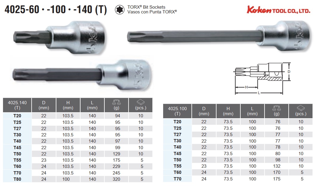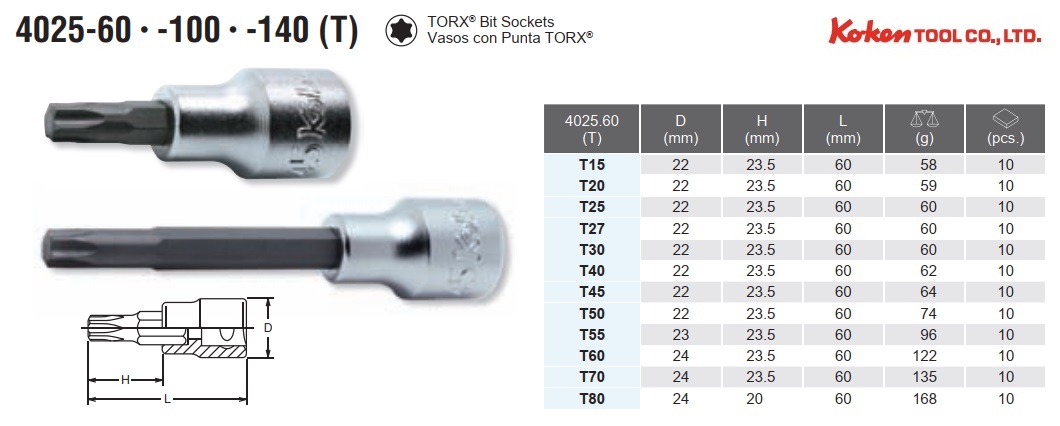 Hoa thị khẩu Koken cỡ 1/2 inch với các lựa chọn đầu mũi từ T20 đến T70 (T80). |