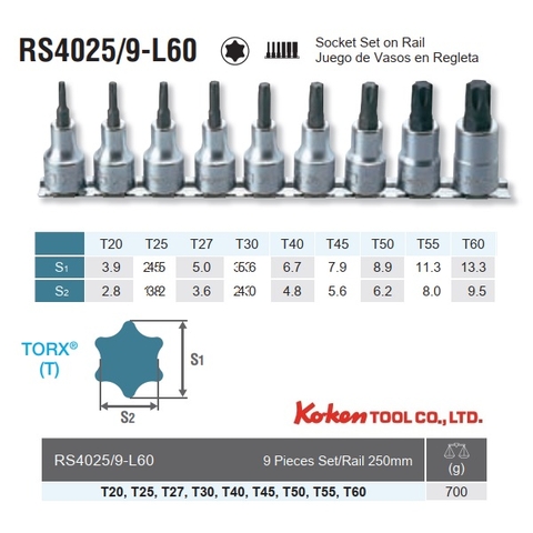 Thông số bộ đầu hoa thị Koken với chân khẩu 1/2 inch RS4025/9-L60: