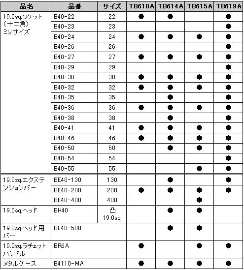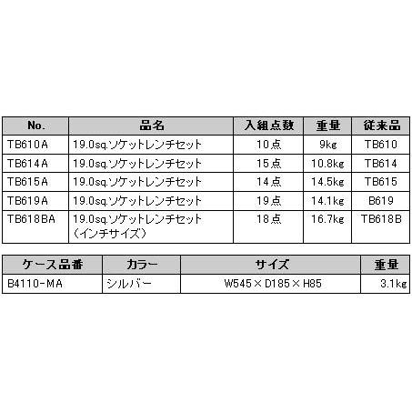 Bộ sản phẩm đầu tuýp (đầu khẩu) 3/4 inch được làm mới Mã số hộp sắt: B4110-MA Mã số mới: TB610A, TB614A, TB615A, TB619A Thay thế TB610, TB614, TB615 và B619 |