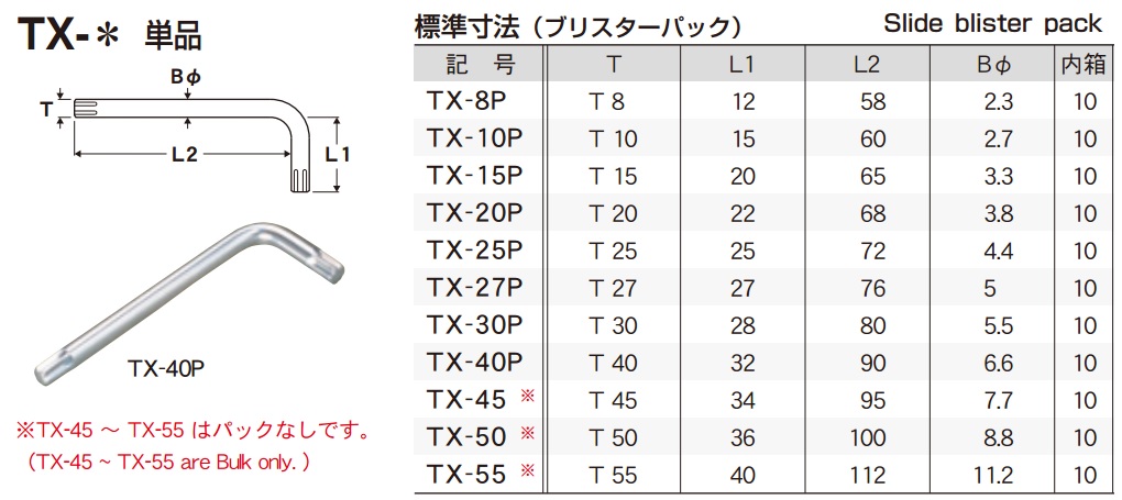 Bộ hoa thị chữ L: TXL-10 Gồm 10 cỡ từ T10 đến T55: Với các cỡ lục giác bông: T10, T15, T20, T25, T27, T30, T40, T45, T50, T55 Các cỡ hoa thị chữ L được bố trí trong vỉ nhựa |