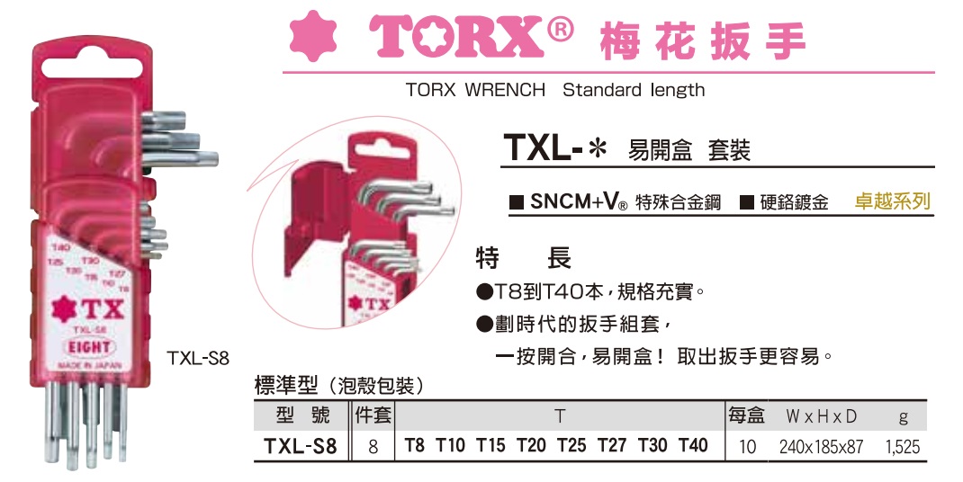 Bộ lục giác EIGHT TXl-10 được sản xuất tại Nhật, với 10 cỡ từ T8 đến T55, có lỗ giữa. |