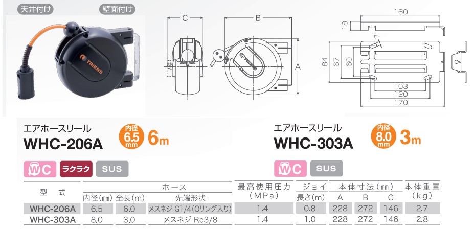Thông số kích thước, trọng lượng cuộn ống hơi WHC-206A: