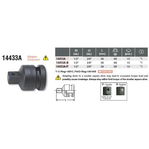 Bảng thông số đầu chuyển từ 1/2 inch sang 3/8 inch, mã số 14433A: