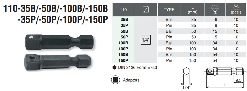 Có các lựa chọn cho chiều dài 35, 50, 100 hay 150mm. Phần nối có lựa chọn bi hoặc chốt. |