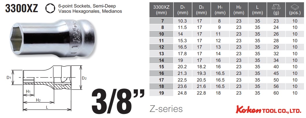 | Đầu khẩu 3/8 inch 3300XZ dòng Z của Koken với chiều dài 35mm, có các lựa chọn từ 7mm đến 19mm Các cỡ phổ thông: 3300XZ-8, 3300XZ-10, 3300XZ-12, 3300XZ-14, 3300XZ-17, 3300XZ-19. |