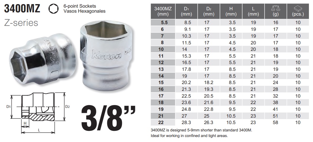 | Đầu khẩu 3/8 inch 3400MZ dòng Z của Koken với chiều dài 19-23mm, có các lựa chọn từ 5.5mm đến 22mm Các cỡ phổ thông: 3400MZ-8, 3400MZ-10, 3400MZ-12, 3400MZ-14, 3400MZ-17, 3400MZ-19 |