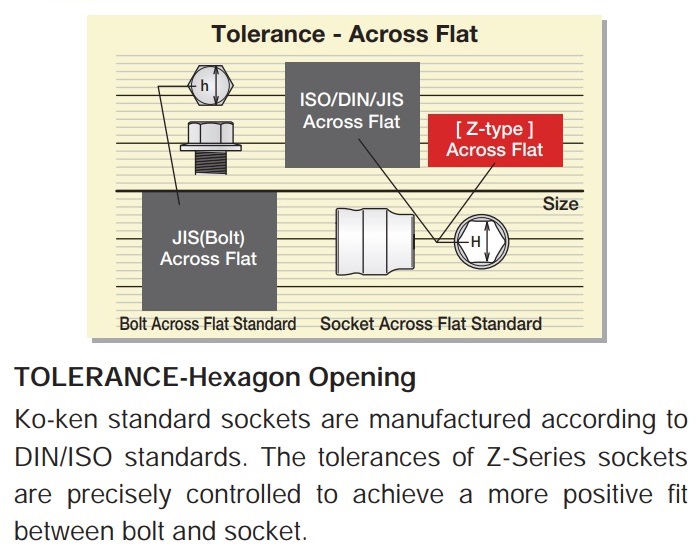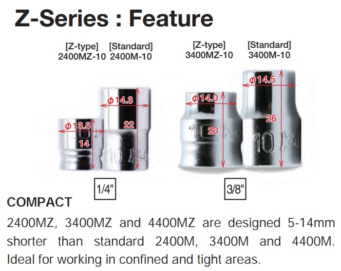 | Đầu khẩu 3/8 inch dòng Z của Koken được thiết kế ngắn hơn so với các loại thông thường khác. Đầu khẩu dòng Z đáp ứng tiêu chuẩn khắt khe hơn loại thông thường (DIN/ISO), kiểm soát khe hở giữa khẩu & đai ốc. |