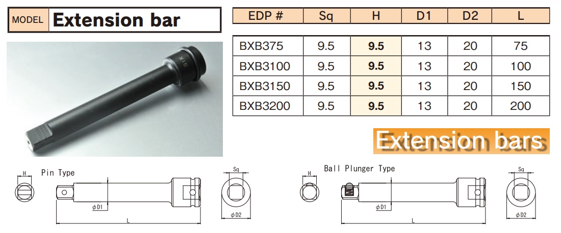 Thanh nối dài BIX Chuyển đổi từ đầu vào và đầu ra là 3/8 inch Dùng cho các loại súng 3/8 inch cho lắp ráp Chiều dài 75, 100, 150, 200mm Mã số tương ứng là BXB375, BXB3100, và BXB3150, BXB3200 |